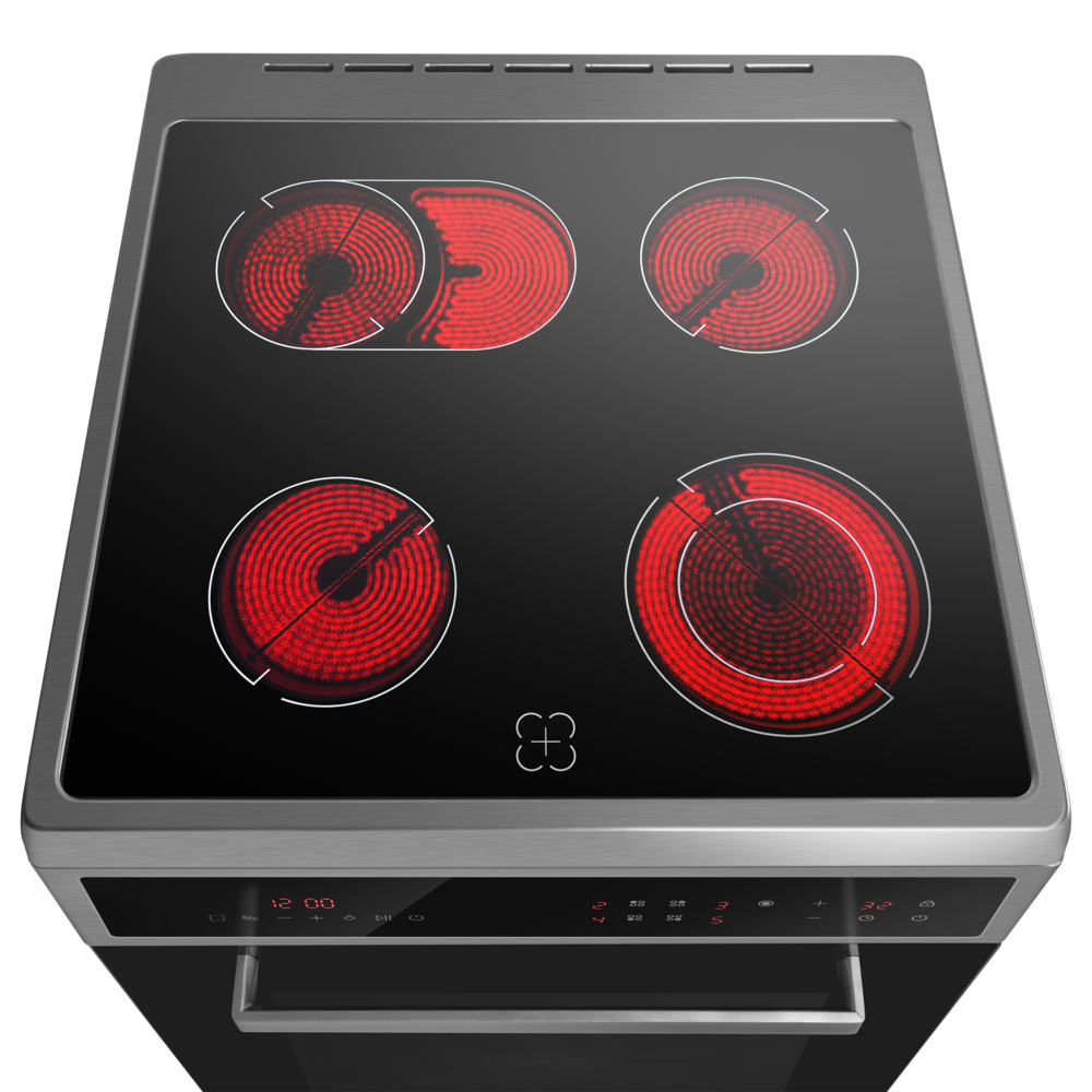 Стеклокерамическая варочная поверхность сочетает привлекательный внешний вид и практичность: гладкая плоскость легко очищается, а двухконтурная зона расширения помогает подстроиться под посуду. Сенсорное управление с дисплеем и индикацией делает взаимодействие интуитивным, а блокировка панели повышает безопасность при работе.