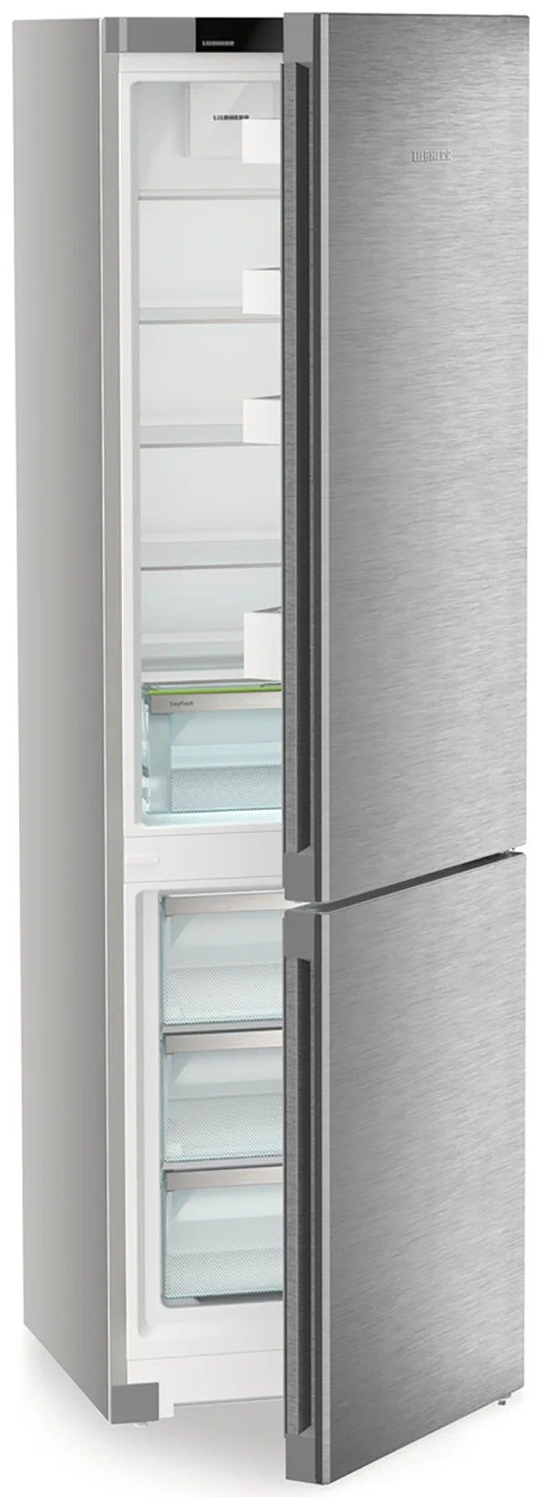 Liebherr CNsdc 5703-22 001 — двухкамерный холодильник для тех, кто ценит продуманную эргономику и аккуратный внешний вид. Поверхность SmartSteel с горизонтальной шлифовкой подчеркивает нержавеющую сталь, защищает от отпечатков и устойчивее к царапинам, а утопленная вертикальная ручка поддерживает минималистичный дизайн и удобство открывания. NoFrost в морозильном отделении избавляет от образования льда и ручного размораживания, экономя время и энергию.