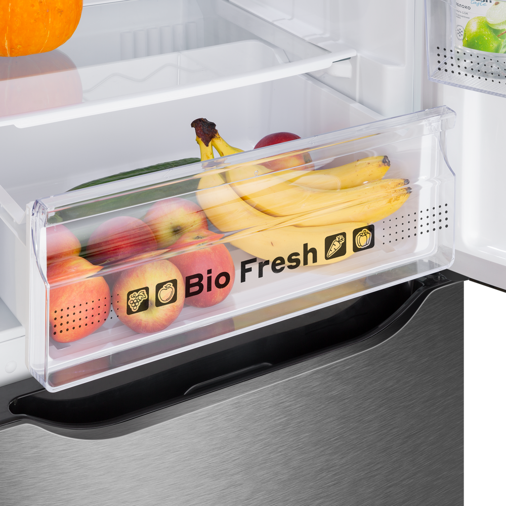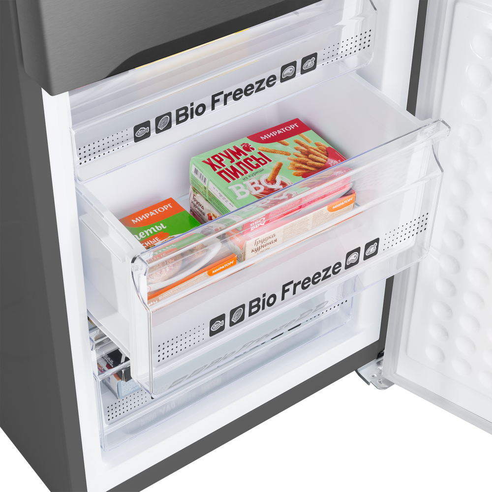 Внутри предусмотрено удобное разделение: в холодильной камере 232 л — стеклянные полки, большой ящик для овощей и фруктов и продуманная дверная зона; в морозильной камере 98 л — выдвижные ящики для быстрого доступа. Благодаря инверторному компрессору модель работает ровно и экономично, а низкий уровень шума 37 дБ комфортен для кухонь-гостиных.