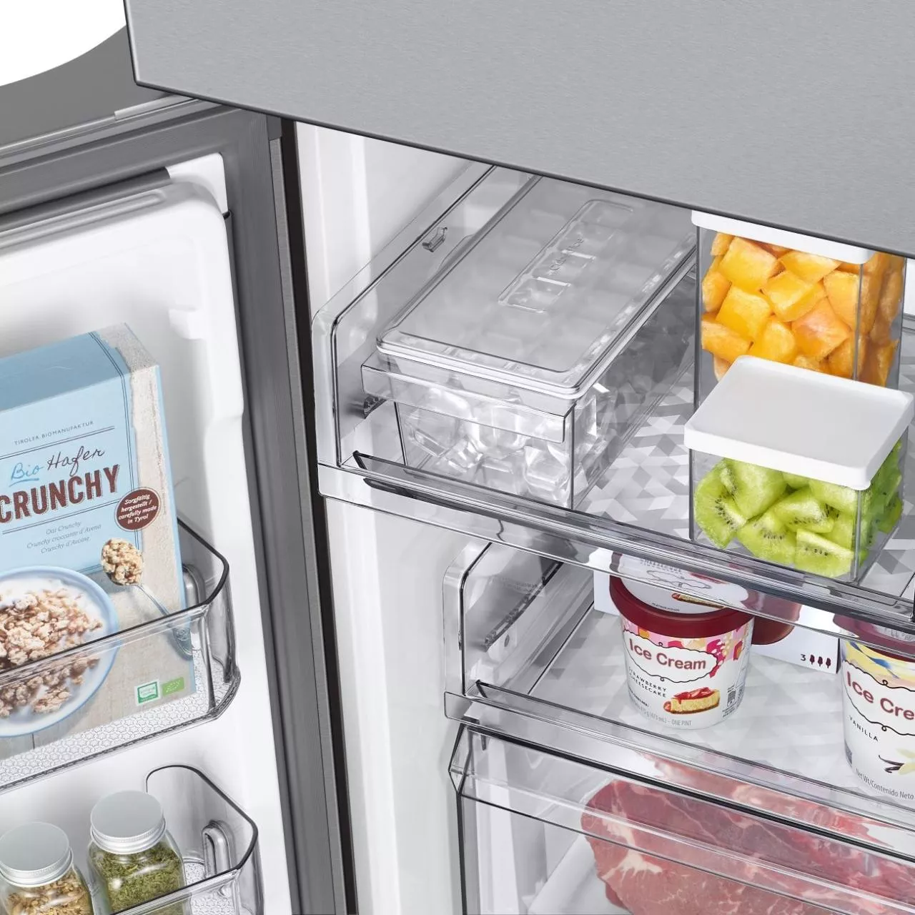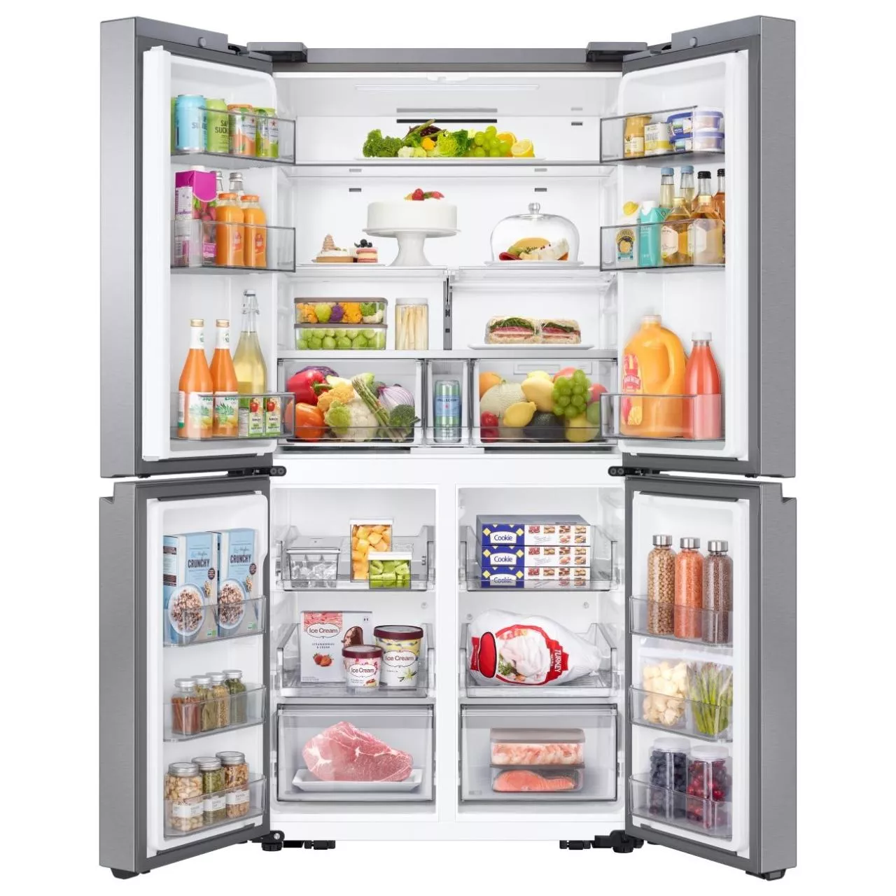 Технология No Frost применяется в обеих камерах, предотвращая образование инея и наледи. Управление осуществляется как электронной панелью, так и дистанционно через приложение SmartThings с поддержкой Wi-Fi.