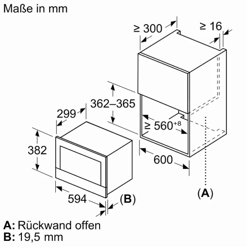 • Габариты ниши для встраивания (В × Ш × Г), см: 38–38.2 × 56–56.8 × 55