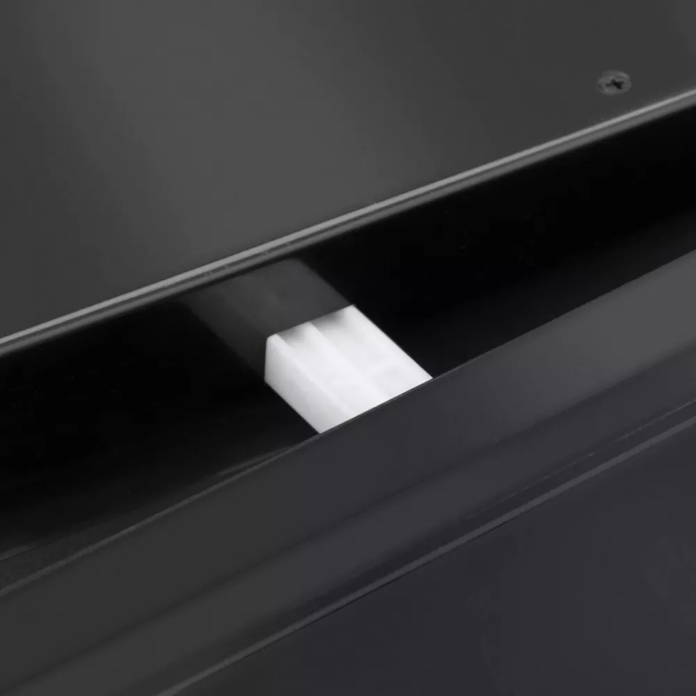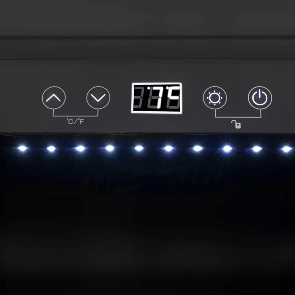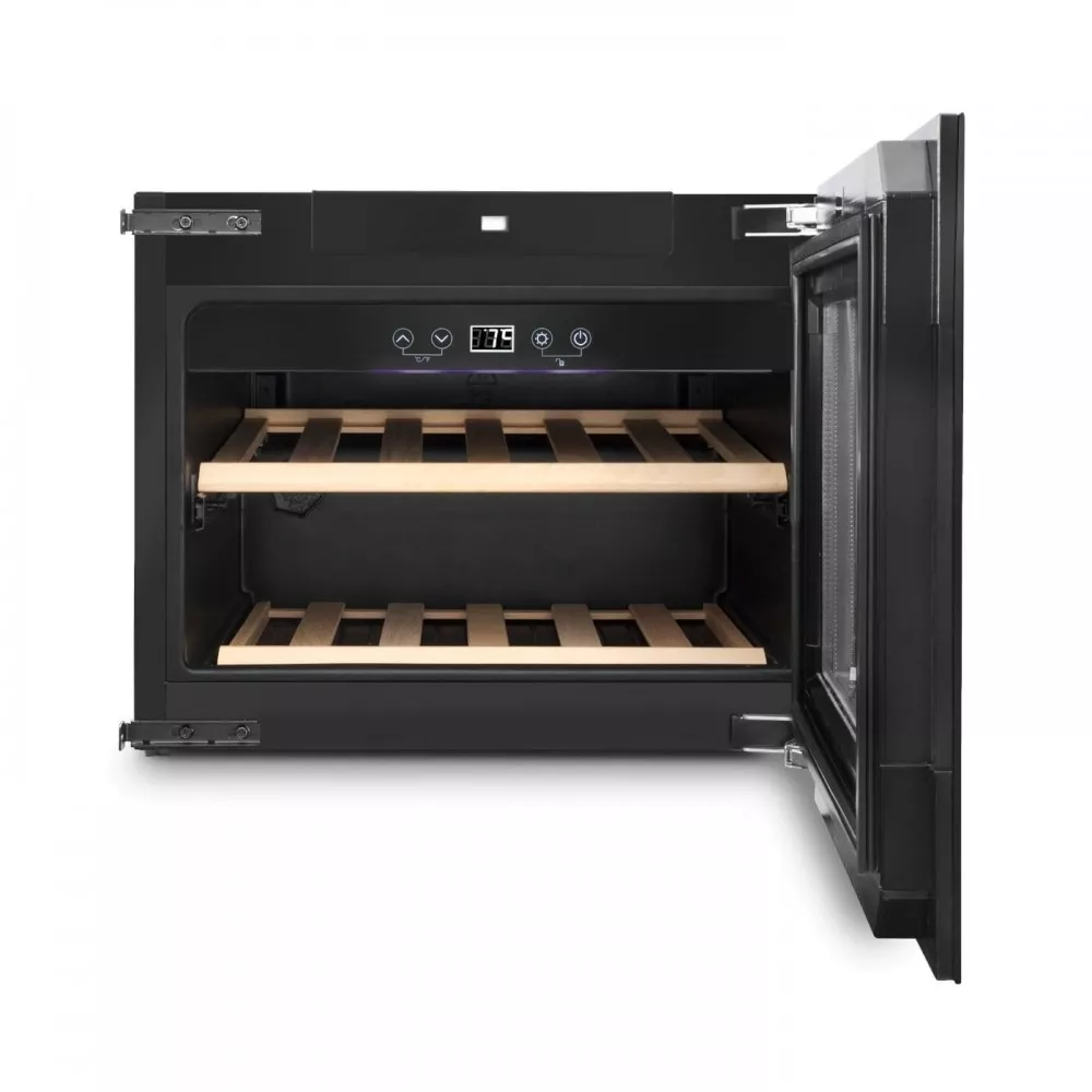 На две выдвижные деревянные полки вмещается до 18 стандартных бутылок. Управление осуществляется при помощи сенсорного дисплея. Регулировка температурных показателей с шагом в 1°C происходит нажатием « ∧ » и «∨». Предусмотрено мягкое внутреннее освещение, с которым можно не открывая дверцы выбрать нужную бутылку или просто полюбоваться своей коллекцией через многослойное стекло с защитой от ультрафиолетового излучения. Ещё одна особенность - это открывание дверцы одним нажатием на петлю Hettich Soft-close