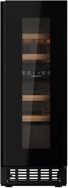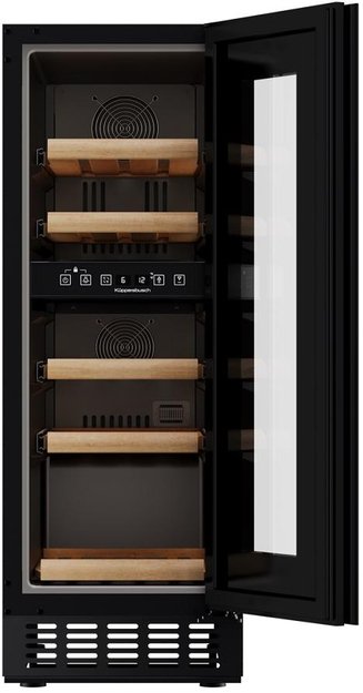 Встраиваемый винный шкаф Kuppersbusch FWKU 1531.0 S — это компактное и стильное решение для хранения вин, разработанное для установки в узкие ниши. Модель выполнена с фасадом из черного стекла: остекленная дверь в черной рамке защищает содержимое от яркого света и позволяет видеть коллекцию. Ручка скрыта в полотне, поэтому фронт остается ровным. Высота корпуса регулируется в пределах 81,5–88,5 см, ширина 29,5 см, глубина 57 см, что позволяет интегрировать шкаф даже в ограниченное пространство. Для установки под столешницу предусмотрена съемная вентиляционная решетка.